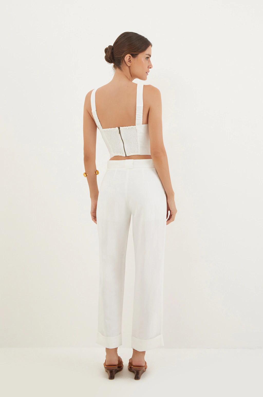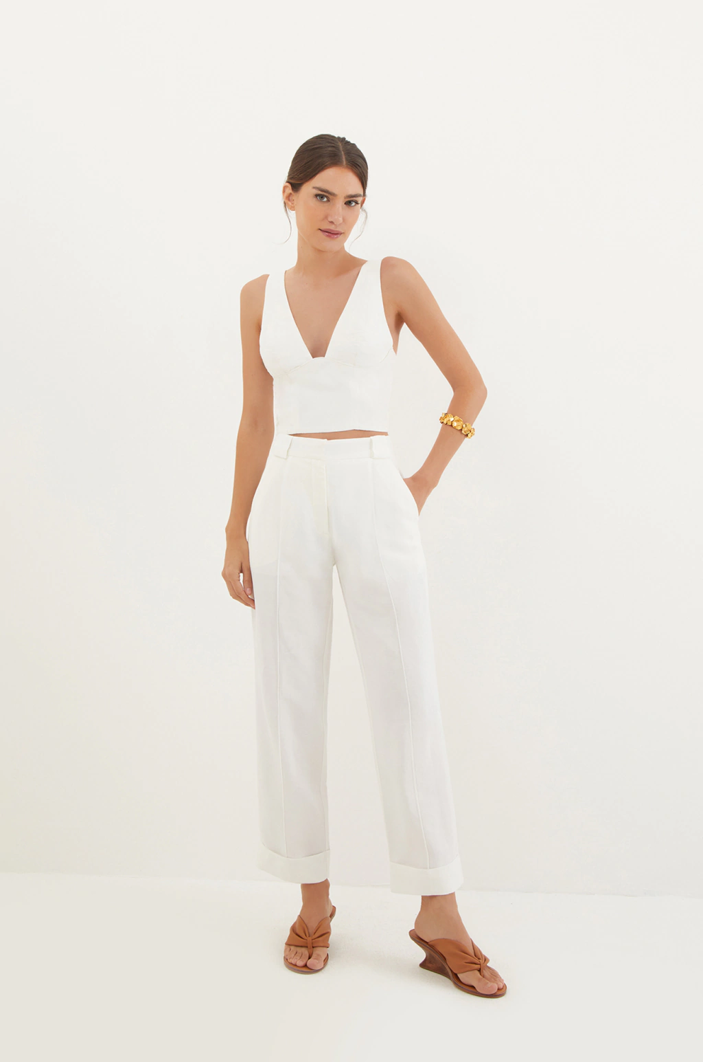 Descrição: Clássica e atemporal, a calça de alfaiataria branca Angelica é uma peça de fit perfeito para ter para sempre. Experimente usá-la com sandálias, bolsas e outros acessórios ViX. - Barra dobrada - Cintura média - Fechamento frontal oculto - Bolsos frontais laterais - Bolso posteriores com debrum - Possui forro Detalhes feitos à mão no ateliê ViX.